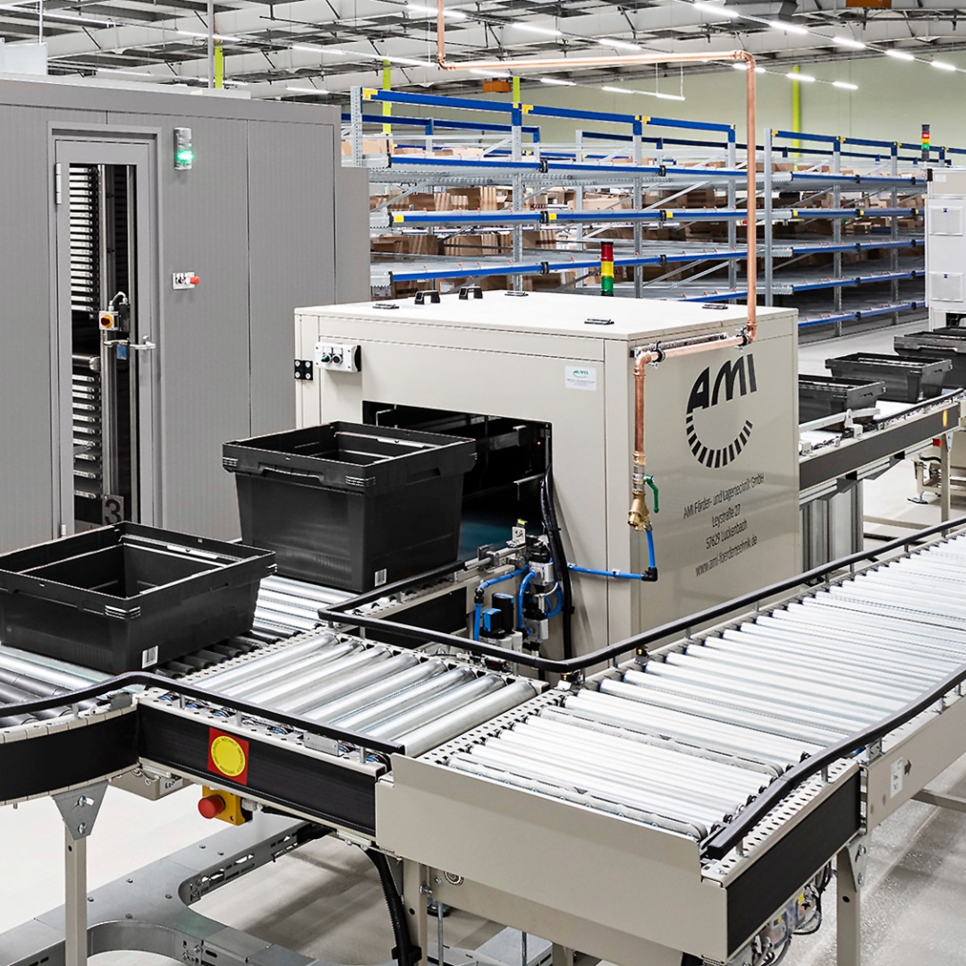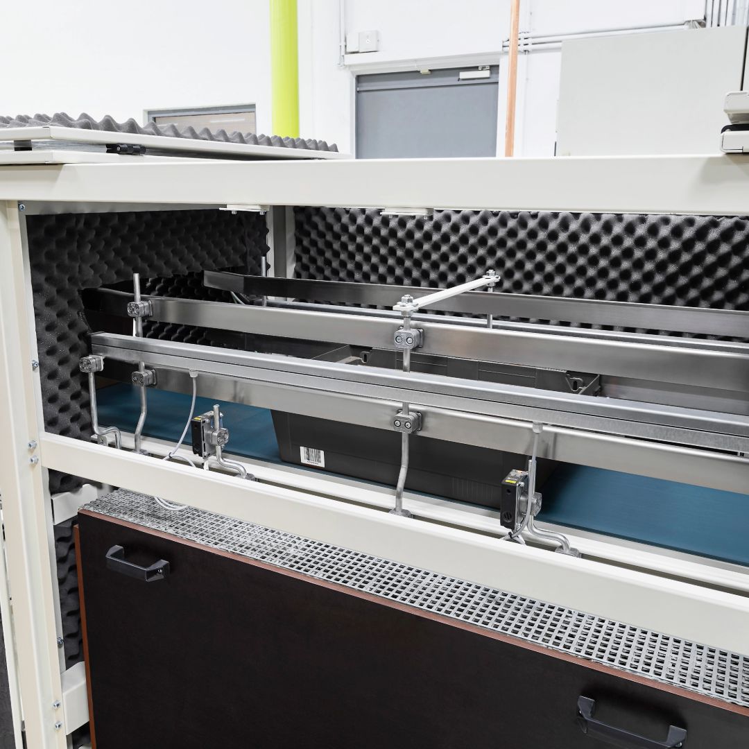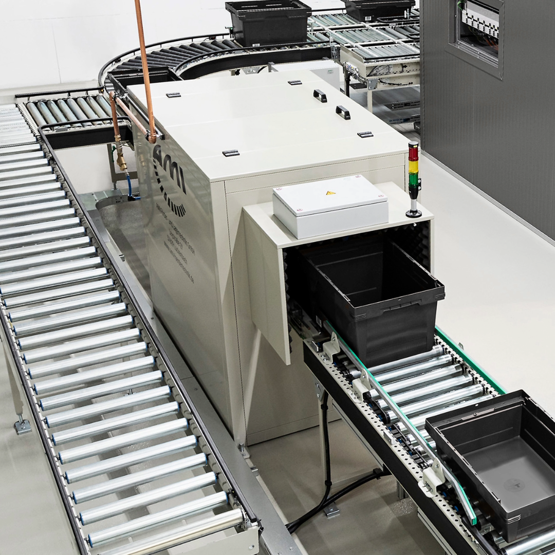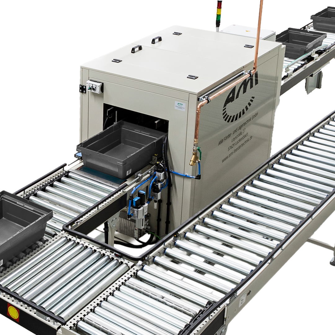 The label blow-off station from AMI enables the fully automatic removal of labels from plastic containers. During the conveying process, the containers are guided past two blow-off hoods arranged one behind the other, with a precise positioning system ensuring exact alignment. The labels are precisely removed and collected in a collection box. The label blow-off station is suitable for various plastic container sizes and can be easily integrated into existing conveyor systems.