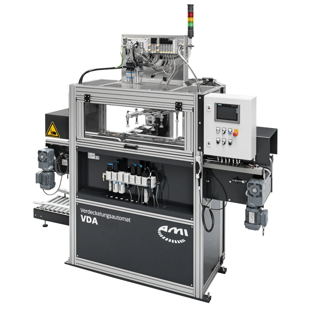 Der Verdeckelungsautomat von AMI ermöglicht das vollautomatische Verschließen von Kunststoffbehältern mit Deckeln – effizient, zuverlässig und präzise. Ein innovatives Greifersystem entnimmt die Deckel einzeln aus einem Stapel und setzt sie passgenau auf die Behälter. Die automatisierte Deckzuführstrecke sorgt für eine kontinuierliche Versorgung des Prozesses, wodurch Unterbrechungen vermieden werden.
